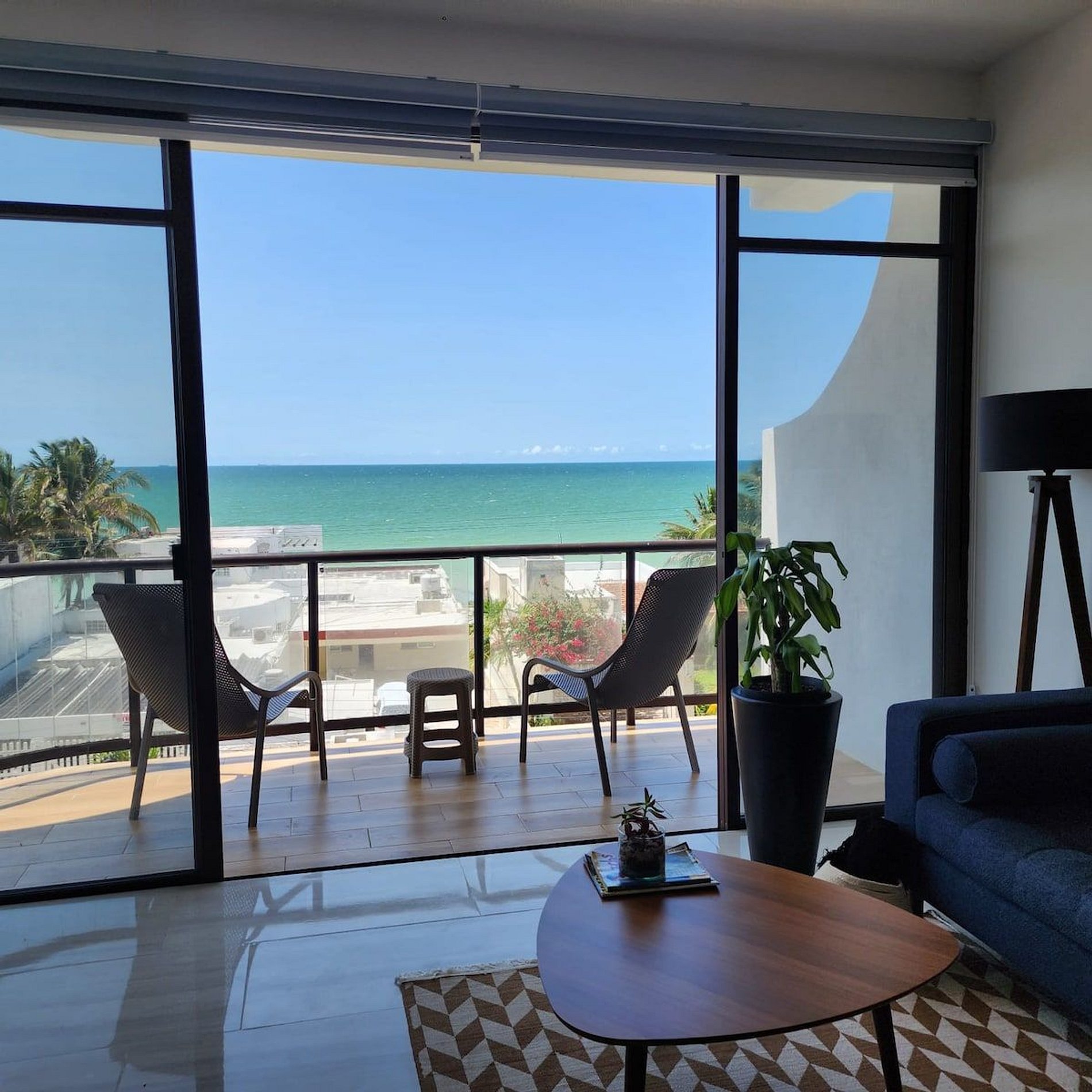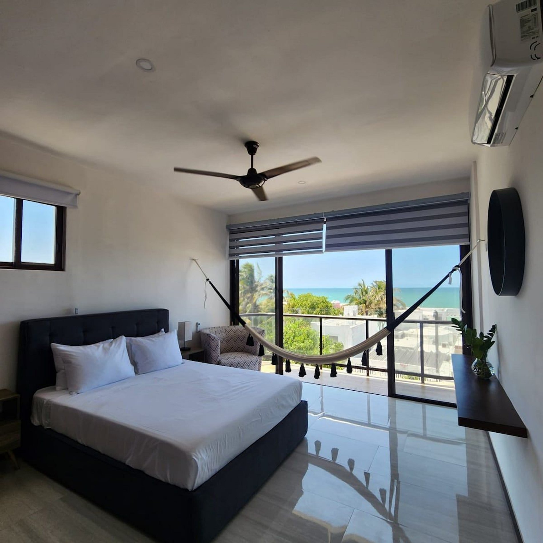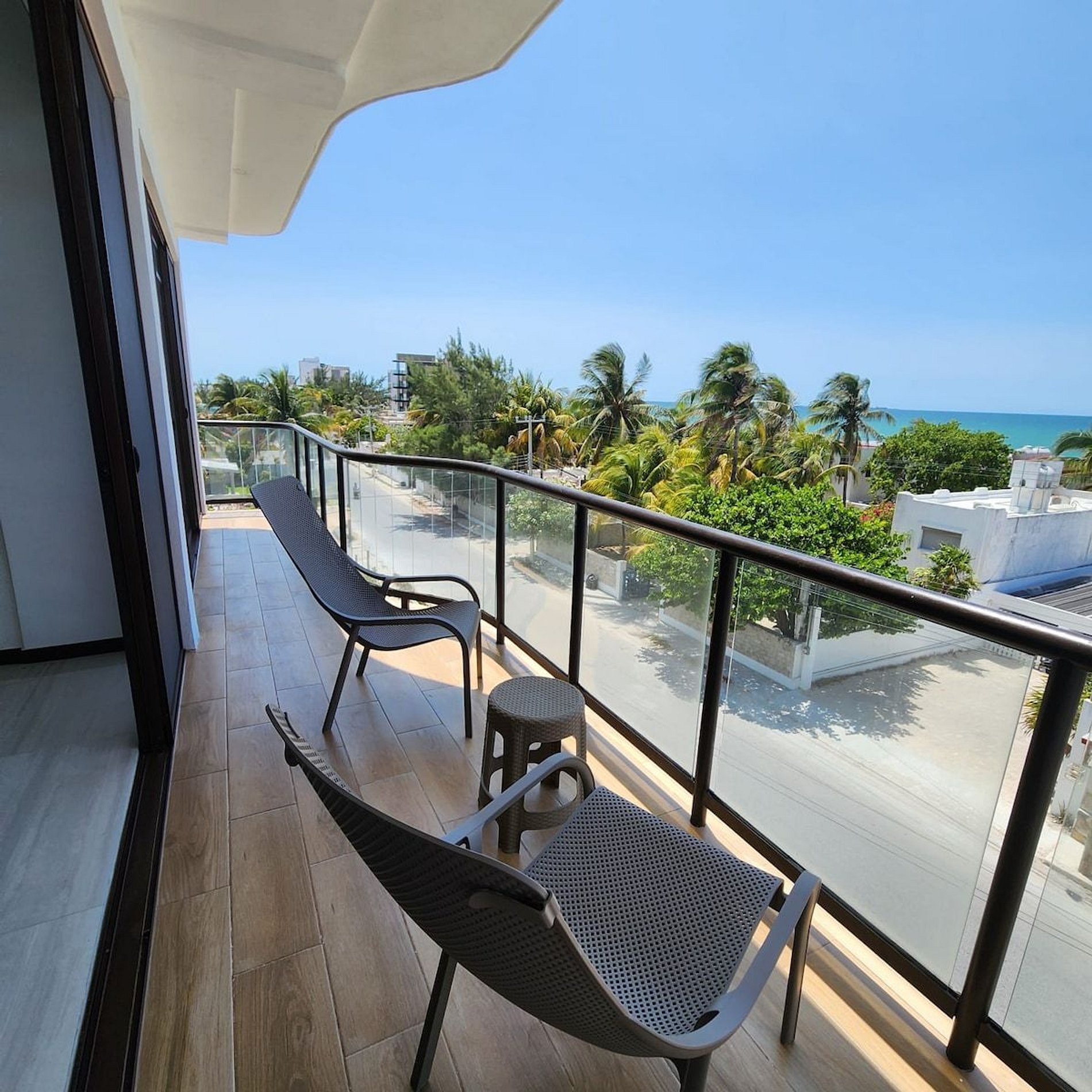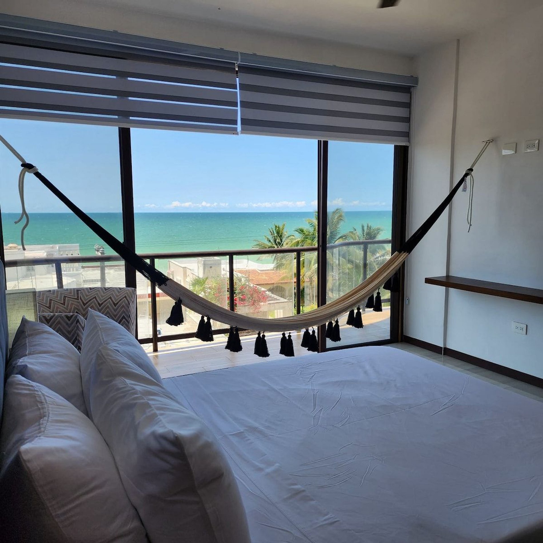 El alojamiento Ubicado en el cuarto piso, disfrutarás de una vista espectacular del hermoso mar de Yucatán... ¡No te preocupes, el edificio cuenta con elevador! El departamento es para 4 personas, cuenta con dos recámaras y dos baños completos. Cocina totalmente nueva y equipada, con comedor y sala. En esa área hay un smart tv y aire acondicionado. Recámara 1: Una cama Queen Hamaquero Baño privado Recámara 2: Una cama Queen Hamaqueros Baño privado Todas las recámaras cuenta con ventilador de techo, aire acondicionado y persianas black out. El edificio cuenta con dos albercas. Una está en la planta baja, donde también se encuentran áreas de uso común con otros huéspedes. Podrás disfrutar de todo el mobiliario (sillas, mesas, camastros). ¡La segunda alberca se encuentra en el rooftop (solo para adultos), la vista es espectacular! También podrás disfrutar de todo el mobiliario, está zona es exclusiva para adultos. Acceso para huéspedes Los huéspedes tienen acceso a todas las áreas en común. La terraza en el rooftop es exclusiva para adultos.